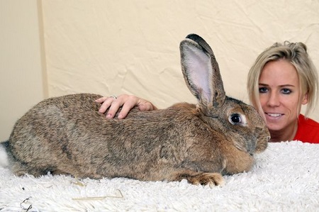 The world's longest bunny pictured here with Clemmie Moodie of Daily Mirror