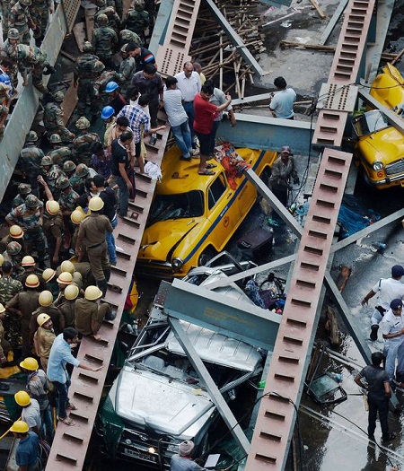 Rescue members carry a victim from the site of an under-construction flyover that collapsed in Kolkata
