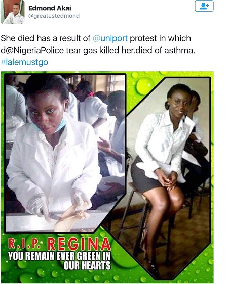 The allegation was made via his twitter handle as he shared a picture of the girl. He wrote: "She died has (sic) a result of @uniport protest in which d @NigeriaPolice tear gas killed her.died of asthma. #lalemustgo"