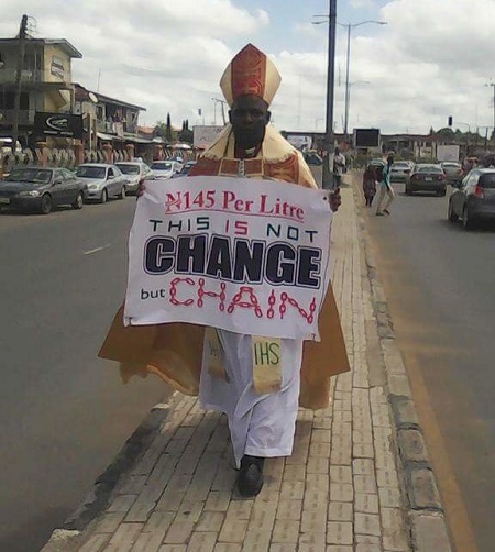 The bishop was dressed in full regalia of his office and hung a placard with the inscription ”N145 per litre: This is not change but chain.” Punch reports.
