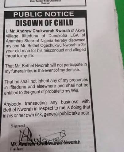 The man identified as Mr Andrew Chukwurah Nworah, has disowned his son publicly.