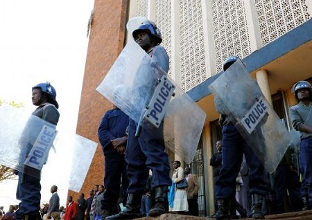 A Zimbabwean anti-riot police stand guard outside the Harare Magistrates court before the arrival of the arrested pastor