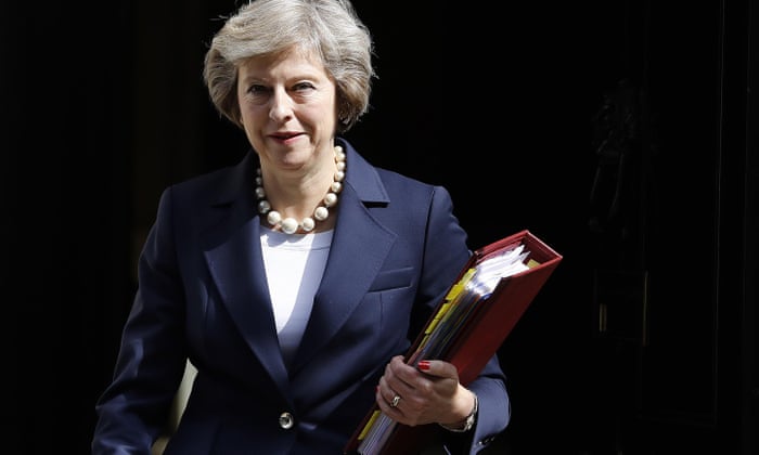 Theresa May leaves 10 Downing street to attend her first Prime Ministers Questions. Photograph: Frank Augstein/AP