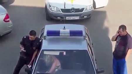 A video has shown the rather dramatic moment when a woman clad only in bikini broke a police car windscreen.