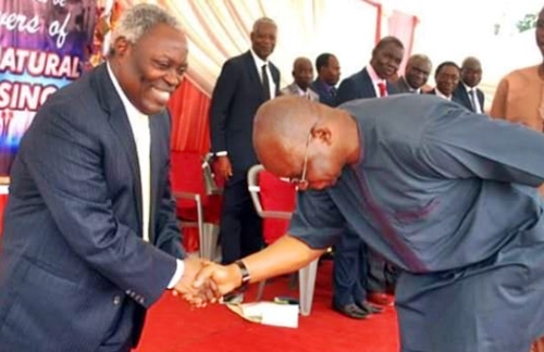 Gov. Fayose bowing to Pastor Kumuiyi at DCLM