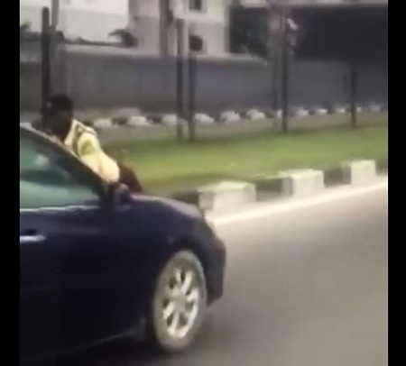 The desperate LASTMA official hanging on the bonnet of a moving vehicle