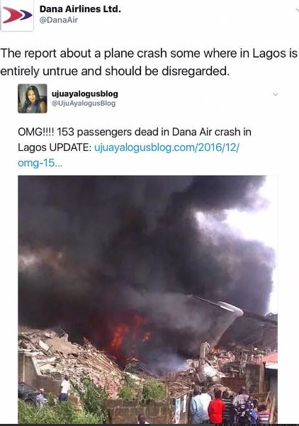 Dana Air has rebuffed reports that one of its aircrafts was involved in a crash in Lagos State on Sunday 11 December 2016.