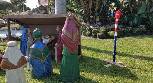 He therefore placed the pole near a nativity scene and decorated it with a “Make America Great Again” hat with a large safety pin through it.