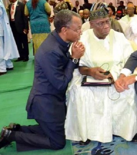 Governor El-Rufai of Kaduna State kneeling before former President Olusegun Obasanjo