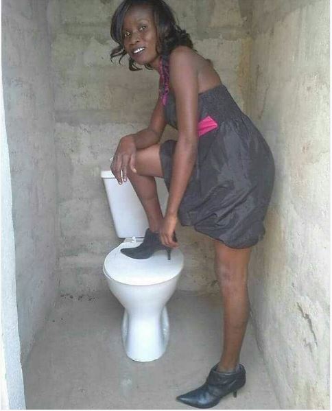 from Nigeria visited a restroom under construction to strike a pose.