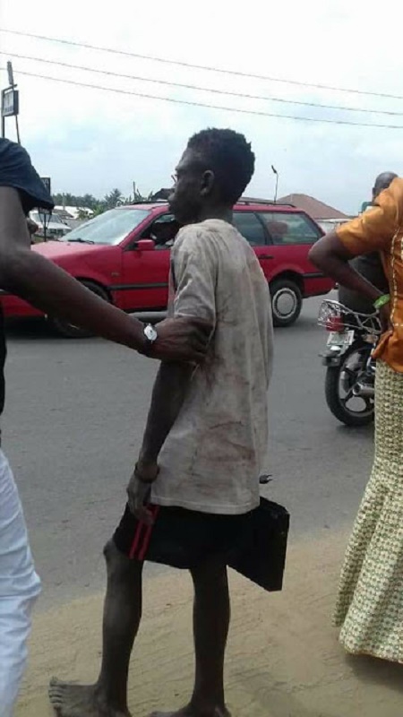 severely beaten and tied up by residents who later handed him over to