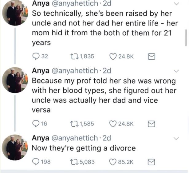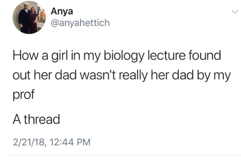 her father, a lady discovered he was not really her father in a biolgy