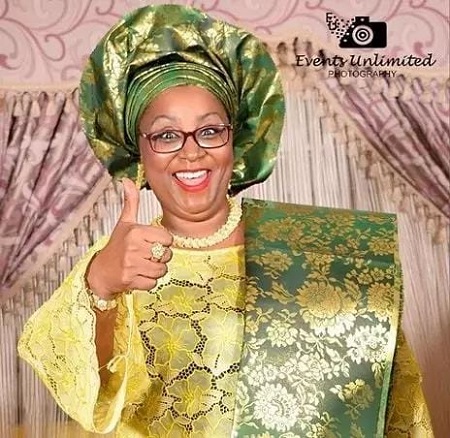 pearl earrings adorns her with her head-tie (gele) carefully tied in