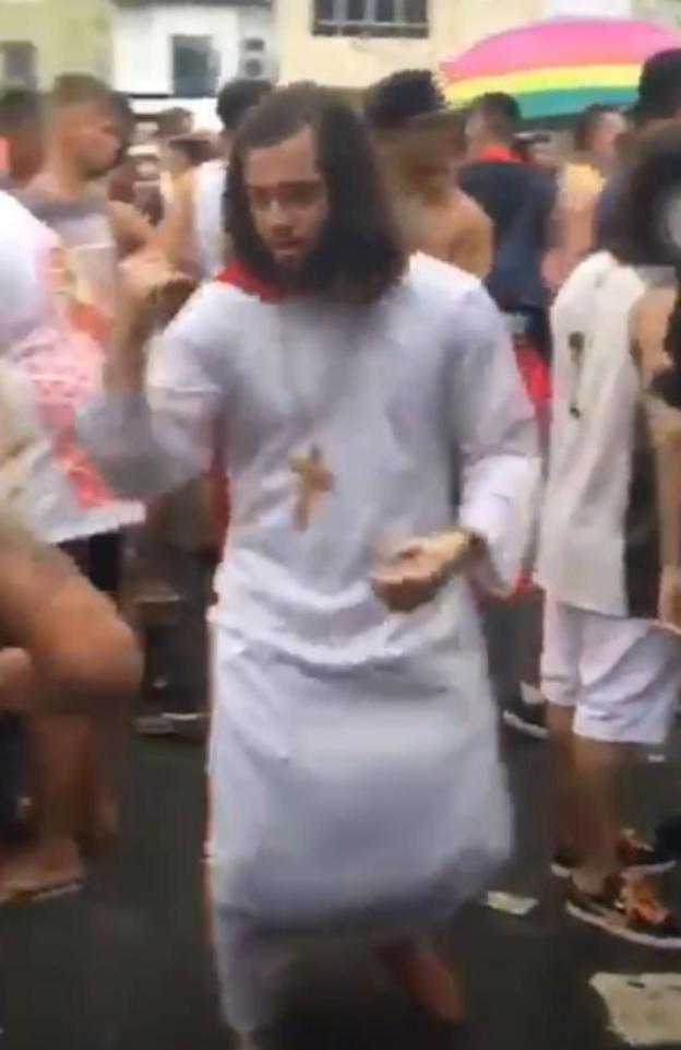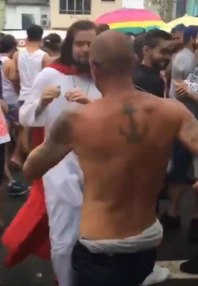 A thug parading around bare-chested during a carnival, has ended up being beaten up by another man clad as Jesus.