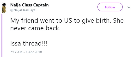 "My friend went to US to give birth. She never came back. Issa thread!!!